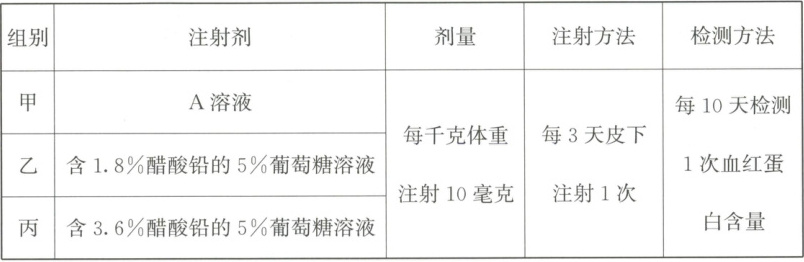 35. (5 分)铅是一种有毒的重金属元素,在人类生产生活中广泛应用,如汽车尾气、含铅涂料和颜料等。铅在人体中具有蓄积性,摄入过量可对神经系统等造成累积伤害。为探究铅对人体血红蛋白是否有影响,科研人员将 30 只大小和健康状况相近的小白鼠平均分为三组进行实验,实验处理方法如下表。(注:醋酸铅是一种含铅化合物)