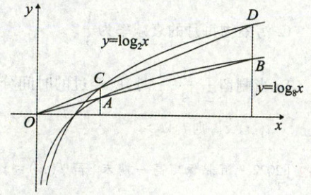 22. (本小题满分 12 分)如图,已知过原点$O$的直线与函数$y=\log_{8}x$的图像交于$A$,$B$两点,分别过点$A$,$B$作$y$轴的平行线与函数$y=\log_{2}x$的图像交于$C$,$D$两点.