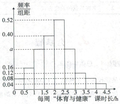教育部发布的《义务教育体育与健康课程标准(2022 年版)》将于 2022 年秋季学期开始正式施行.新课标显示,“体育与健康”课超越外语成为小、初阶段第三大主科.某市为了调查小学生每周的“体育与健康”课的时长(单位:h),随机抽取了该市 100 名小学生,将数据按照$[0,0.5)$,$[0.5,1)$,…,$[4,4.5]$分成 9 组,制成了如图的频率分布直方图.