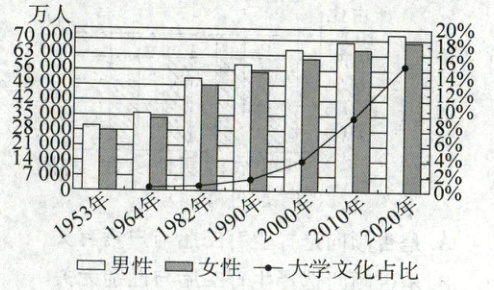 6.D 【解析】由题图知,相比1964年,1982年人口普查时男、女性的总人数增加数是相邻两次普查人数增幅最大的,即1964年至1982年间人口平均增长率最大,A正确;自1982年后,从统计图呈现的人口增长趋势知,每相邻两次普查人数增加数在减小,即人口的增长率降低,全国总人口增长速度放缓,B正确;从有大学文化人数占比的折线图呈现的增长趋势知,具有大学文化的人数占比的增幅逐步增大,C正确;从历次人口普查时男、女性人数条形图高的差可知,男、女性人数的差值并未呈现逐步减小的趋势,D不正确。故选D。
