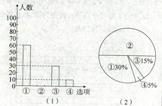 (2)被调查的学生中,选②的有$200 - 60 - 30 - 10 = 100$(人)。