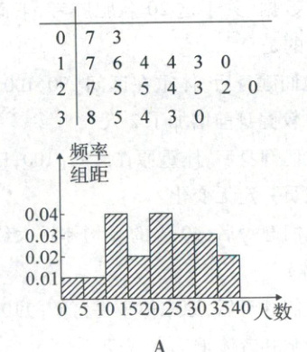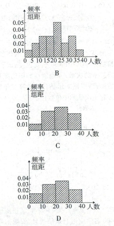 2. 某学校随机抽取 20 个班,调查各班中有网上购物经历的人数,所得数据的茎叶图如图。以 5 为组距将数据分组成[0,5),[5,10),[10,15),…,[30,35),[35,40]时,所作的频率分布直方图是(