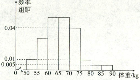 3.C 【解析】由后四组的频率值可得前四组的频率之和为$1 - 0.005×5×2 - 0.01×5 - 0.04×5 = 0.7$(频率对应矩形的面积,解题时要注意正难则反的原则),所以第二组的频率为$0.7×\frac{3}{14}=\frac{3}{20}=0.15$,所以抽取的样本容量为$60÷\frac{3}{20}=400$,故A正确;体重在$[65,70)$的频率为$0.7×\frac{5}{14}=0.25$,B正确;若该大学共有学生36 000人,则体重超过80 kg的估计有$0.005×2×5×36 000 = 1 800$(人),C错误;设抽取学生体重的中位数为$x$,则$0.01×5 + 0.15 + 0.25 + 0.05×(x - 65)=0.5$,解得$x = 66$,D正确。故选C。