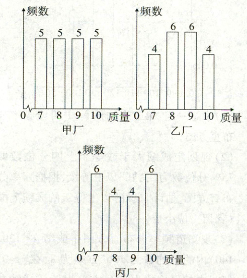 1.C 【解析】根据题意,甲厂袋装食品质量的平均数$\bar{x}_{1}=\frac{1}{20}×(5×7 + 5×8 + 5×9 + 5×10)=8.5$,方差$s_{1}^{2}=\frac{1}{20}×[5×(7 - 8.5)^{2}+5×(8 - 8.5)^{2}+5×(9 - 8.5)^{2}+5×(10 - 8.5)^{2}]=1.25$,标准差$s_{1}=\sqrt{1.25}$;乙厂袋装食品质量的平均数$\bar{x}_{2}=\frac{1}{20}×(4×7 + 6×8 + 6×9 + 4×10)=8.5$,方差$s_{2}^{2}=\frac{1}{20}×[4×(7 - 8.5)^{2}+6×(8 - 8.5)^{2}+6×(9 - 8.5)^{2}+4×(10 - 8.5)^{2}]=1.05$,标准差$s_{2}=\sqrt{1.05}$;丙厂袋装食品质量的平均数$\bar{x}_{3}=\frac{1}{20}×(6×7 + 4×8 + 4×9 + 6×10)=8.5$,方差$s_{3}^{2}=\frac{1}{20}×[6×(7 - 8.5)^{2}+4×(8 - 8.5)^{2}+4×(9 - 8.5)^{2}+6×(10 - 8.5)^{2}]=1.45$,标准差$s_{3}=\sqrt{1.45}$。所以$s_{3}>s_{1}>s_{2}$。故选C。
