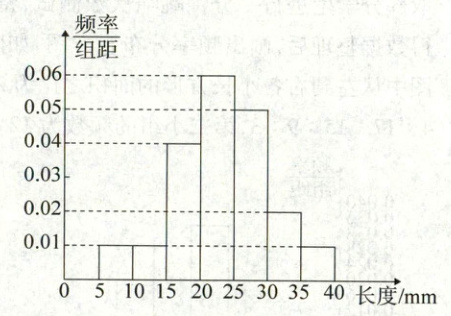 2.A 【解析】棉花纤维的长度在30 mm以下的比例为$(0.01 + 0.01 + 0.04 + 0.06 + 0.05)×5 = 0.85 = 85\%$,在35 mm以下的比例为$85\% + 10\% = 95\%$,因此,90%分位数一定位于$[30,35)$内。由$30 + 5×\frac{0.90 - 0.85}{0.95 - 0.85}=32.5$,可以估计棉花纤维长度的样本数据的90%分位数是32.5 mm。故选A。