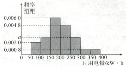 5. [2022·天津南开中学高三期中]某学校的环保志愿者小组为了研究 2 000 户家庭用电情况,在全校学生家庭中抽取了 100 户进行调查,发现这些家庭的月用电量都在 $ 50\sim 400\ kW·h $ 之间,并画出了如图的频率分布直方图. 则这 2 000 户家庭中,月用电量在 $ 250\sim 300\ kW·h $ 之间的户数为(