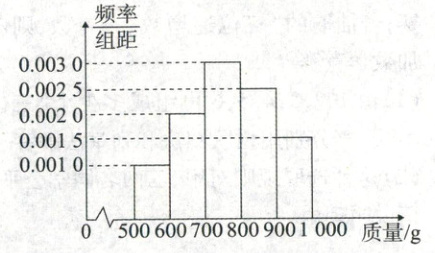 5. [2022·河南许昌高一期末]鱼塘中养了某种鱼,到了收获季节,鱼塘主人为了了解鱼塘中鱼的情况,通过随机撒网的方式捕了 200 条鱼,逐个称重,发现质量(单位:$g$)都在$[500,1000]$之间,这些鱼的质量按照$[500,600)$,$[600,700)$,$[700,800)$,$[800,900)$,$[900,1000]$分组得到频率分布直方图如下: