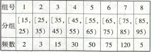 (3)样本的平均数为$\overline{x} = \frac{20×2 + 30×3 + 40×15 + 50×30 + 60×50 + 70×75 + 80×120 + 90×5}{300} \approx 68.43$,