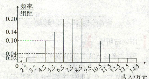 【解析】该地农户家庭年收入低于$4.5$万元的农户的比率估计值为$(0.02 + 0.04)×1 = 0.06 = 6\%$,故A不符合题意;该地农户家庭年收入不低于$10.5$万元的农户比率估计值为$(0.04 + 0.02×3)×1 = 0.10 = 10\%$,故B不符合题意;该地农户家庭年收入介于$4.5$万元至$8.5$万元之间的比例估计值为$(0.10 + 0.14 + 0.20×2)×1 = 0.64 = 64\% > 50\%$,故D不符合题意;该地农户家庭年收入的平均值的估计值为$3×0.02 + 4×0.04 + 5×0.10 + 6×0.14 + 7×0.20 + 8×0.20 + 9×0.10 + 10×0.10 + 11×0.04 + 12×0.02 + 13×0.02 + 14×0.02 = 7.68$(万元),超过$6.5$万元,故C符合题意。选C。