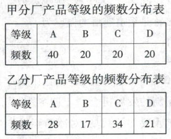 (1) 由表可知,甲厂加工出来的一件产品为A级品的概率为$\frac{40}{100} = 0.4$,乙厂加工出来的一件产品为A级品的概率为$\frac{28}{100} = 0.28$。