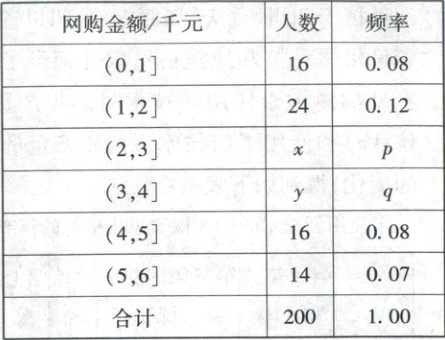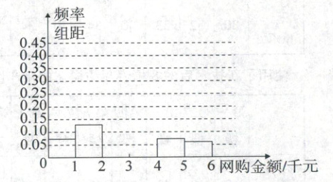 (1)可知,网购金额不高于3000元的频率为$0.08 + 0.12 + 0.4 = 0.6$,所以网购金额的中位数在$(2, 3]$内,故网购金额的中位数约为$3 - \frac{0.1}{0.4} = 2.75$(千元)。