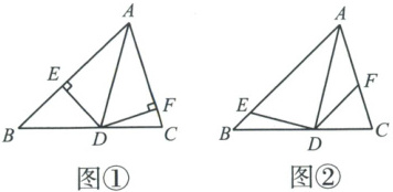上,且DE⊥AB,垂足为E,DF⊥AC,垂足为F,则可以得到两个结论:①∠AED+