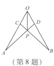 8. 如图,在∠AOB的两边上截取AO = BO,OC = OD,连接AD,BC,且AD,BC相交于点P,连接OP,则图中共有全等三角形(