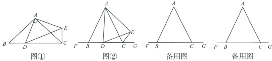 在△ABC中,AB = AC,D是直线BC上一点(不与点B,C重合),以AD为一边在AD的右侧作△ADE,使AD = AE,∠DAE = ∠BAC,连接CE.