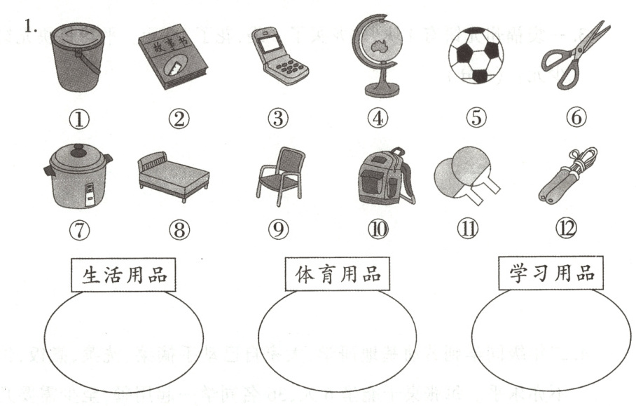 生活用品:①⑥⑦⑧⑨;体育用品:⑤⑪⑫;学习用品:②③④⑩