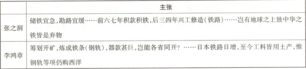 解题思路根据材料可知,张之洞认为应该先储铁、发展冶铁业,后修铁路;李鸿章则认为开矿、炼钢轨耗费巨大,且不能各省一同开始,并借用日本铁路发展虽迅速,但却从西方购买钢轨的事实说明可以先修筑铁路。由此可知,二人争论的焦点是修筑铁路与炼铁孰先孰后的问题,故D项正确。李鸿章仅对日本铁路发展进行阐述,为其观点进行论证,并非主张借鉴明治维新,排除A项;材料并未涉及外债问题,排除B项;二人争论的是开矿、发展矿冶业和炼铁轨、修筑铁路的先后问题,并非军事工业和民用工业孰重孰轻的问题,排除C项。