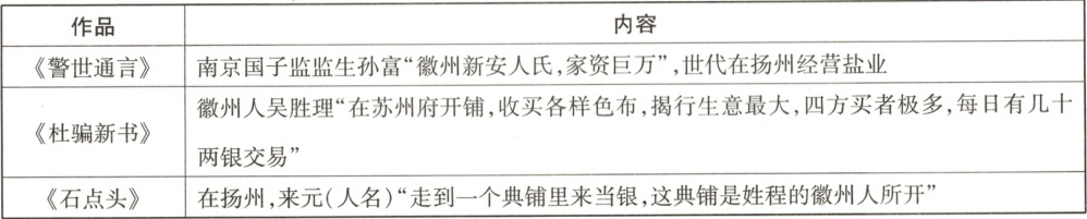 解题思路根据材料可知,《警世通言》记载有徽州新安人孙富的家族“世代在扬州经营盐业”,《杜骗新书》记载有徽州人吴胜理在苏州府开布铺,《石点头》记载有来元在扬州去姓程的徽州人所开的典铺里当银;结合所学知识可知,明朝后期一些地方的人以经商闻名,形成实力雄厚的商人群体,如安徽南部的徽商,与材料中三则明代小说都提及徽州人的商业经营相吻合,折射出当时地域性商人群体的活跃,故C项正确。典当业在明代以前已经出现,排除A项;仅由材料中明代小说对徽州人商业活动的描写,并不能说明徽商热衷资助文学创作,排除B项;材料仅涉及徽商在各地开设商铺,并未涉及货物的贩运,排除D项。