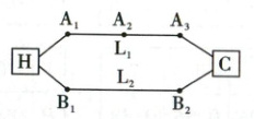 17. [2023·陕西西安高二期末]如图,小明家住 H 小区,他每天早上骑自行车去 C 学校上学,从家到学校有 $ L_1,L_2 $ 两条路线,$ L_1 $ 路线上有 $ A_1,A_2,A_3 $ 三个路口,每个路口遇到红灯的概率均为 $ \frac{1}{2} $;$ L_2 $ 路线上有 $ B_1,B_2 $ 两个路口,且 $ B_1,B_2 $ 路口遇到红灯的概率分别为 $ \frac{3}{4},\frac{3}{5} $.