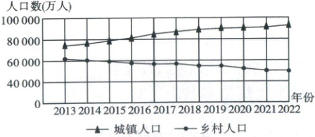 6. [2023·辽宁阜新高二期末]如图是 2013—2022 年全国城镇人口、乡村人口的折线图。根据折线图,下列说法错误的是(