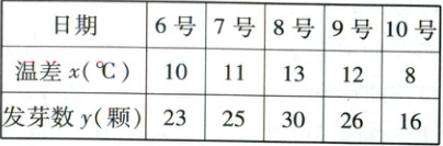 21. [2023·陕西高三一模]某市为了提高蔬菜供应质量,科研所对冬季昼夜温差的大小与某种反季节蔬菜的生长的关系进行研究,他们记录了当地冬季某月$6$号到$10$号间的有关数据,每天的昼夜温差和每天每$100$颗种子中的发芽数,如下表: