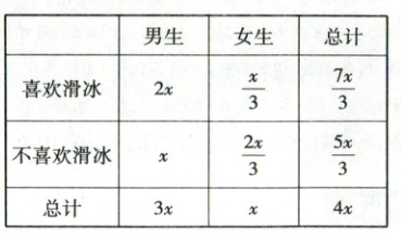 【解析】设男生人数为$3x$,则女生人数为$x$(当只知道比例关系,不知具体数据时,设参数,最后都会消掉),且$x\in\mathbf{N}_{+}$,可得$2×2$列联表如下: