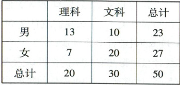 10. 0.05 【解析】因为$\chi^{2}=\frac{50×(13×20 - 10×7)^{2}}{20×30×23×27}\approx4.844$,且$P(\chi^{2}\geq3.841)\approx0.05$,所以认为选科与性别有关系出错的概率约为$0.05$。