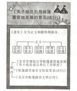 解题思路 由《意见(试行)》正文和附件两部分内容可知,这一文件一方面规范了露营相关行业行为,另一方面也规范了政府权力运行,明确政府在规范引导帐篷露营地发展中的职责、权限和工作流程等,A正确。乡规民约是中国由乡村群众集体制订,并共同遵守的行为规范。《关于规范引导帐篷露营地发展的意见(试行)》属于规范性文件,不属于乡规民约,B错误。制定该文件体现了政府关注新兴领域,但其目的不仅仅是规范市民露营行为,更重要的是引导露营市场健康有序发展,释放消费活力,促进经济社会发展,C错误。单行条例是民族自治地方的人民代表大会依照当地民族的政治、经济文化的特点制定的调整本自治地方某方面事务的规范性文件。《关于规范引导帐篷露营地发展的意见(试行)》属于规范性文件,不属于单行条例,且“社会自我治理”说法错误,D排除。