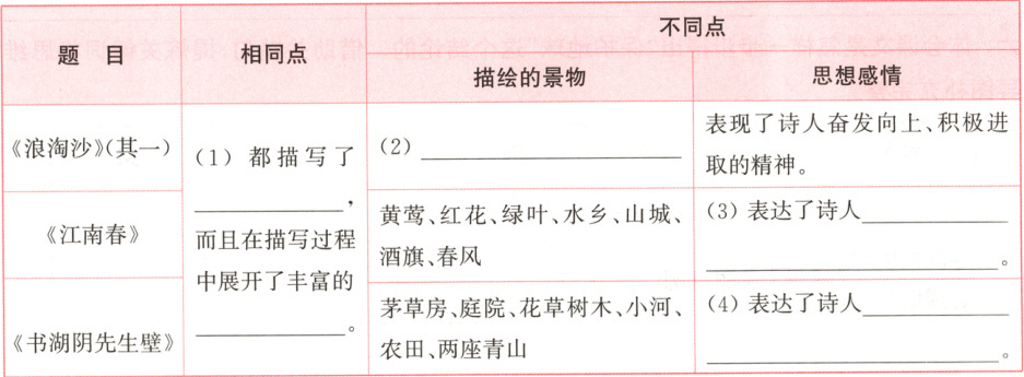 六、(1)自然景物 想象 (2)黄河 (3)对祖国大好河山的喜爱与赞美之情,以及对朝代兴衰的慨叹