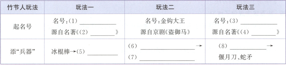 ③ 用铅皮剪一把偃月刀,用铁丝系一绺红丝线做一柄蛇矛,给那竹节人装上,再挖空心思取一个更威风、更吓人、叫得更响的名号。