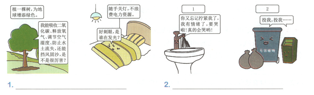 6月5日是世界环境日。请参照前两幅图的宣传标语,为后两幅图写上宣传标语。