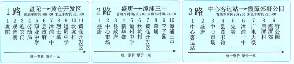 D. 坐 3 路公交,从盛唐站出发坐 1 站到中心市场站下车,再换 2 路公交,坐 1 站到县政府站下车,再换 1 路公交坐 1 站到漳浦一中站。