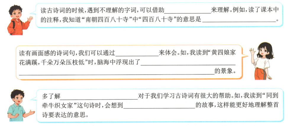 一、自然景观是大自然给予我们的宝贵财富,让我们从古诗词中体会自然之美吧。同学们正在就“如何学习古诗词”的话题进行讨论,请补全对话。
