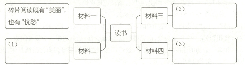 1. (思维导图)以上四则材料都与读书有关,它们分别告诉我们什么呢?请你概括材料内容,并填写思维导图。(3分)