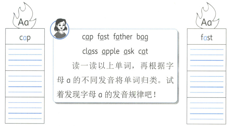 左侧(字母a发/æ/):cap, bag, apple, cat