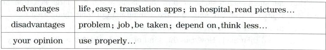 如今,人工智能(artificial intelligence, 简称AI)已走进人们的生活,它正迅速地改变着世界。一方面,它给大家带来诸多便利,比如,有的翻译软件,它能使人们轻松与外国人交流,在医院……。另一方面,它也引发不少问题,例如很多工作将被人工智能取代,许多人会失去工作,有的人过于依赖AI而不会自己思考了……。请你根据下表提示,以“AI in Our Life”为题写一篇英语短文,介绍同学们的不同观点,并谈谈你的看法。