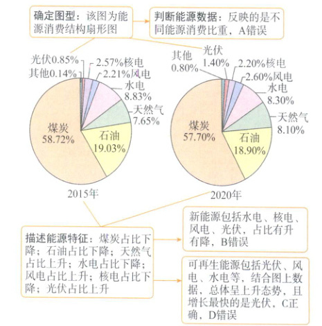 (1)小题的关键点是结合图判读不同能源消费比重的变化。本图只显示消费结构,没有说明消费总量,实际消费量=消费比例×消费总量。在能源消费构成中,煤炭、石油的消费比重下降并不等于消费量下降。与2015年相比,2020年煤炭、石油的消费比重下降,但若我国能源总消费量是增加的,煤炭、石油的消费总量也可能是增加的。