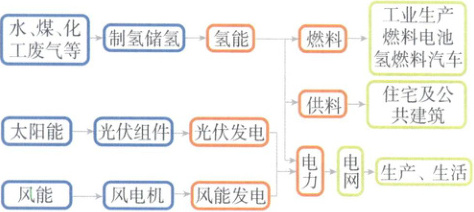 例4 [广东惠州2023高二期中]山西省大同市素有“煤都”之称。近年来,大同市大力发展新能源,把太阳能、风能、煤炭资源集优势转化为绿色产业优势,打造“新能源产业之都”,并积极融入京津冀协同发展。自2017年以来,大同市相继建设能源改革科技创新产业园和新能源产业城,培育和发展氢能与燃料电池先导、储能蓄能、新能源汽车装备制造、光伏全产业链和煤炭清洁高效利用五大产业集群。下图示意大同市新能源产业链。据此完成下面小题。