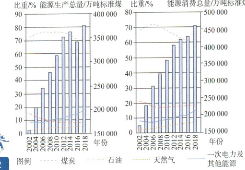 [吉林白城2023高二月考]能源问题关系到国计民生,我国的能源生产和消费一直形势严峻。下图示意我国2002—2018年能源生产总量、能源消费总量与结构变化状况。据此完成下面小题。