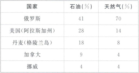 [山东新泰一中2023高二段考]北极地区拥有丰富的油气资源,全球30%的未开发天然气资源和13%的未开发的石油资源都集中在北极地区。下表示意北极地区未开发油气储量分布。读表,完成下面小题。