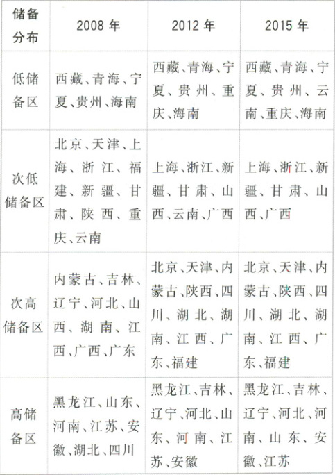 [河北邢台 2023 三模]粮食储备是维护粮食安全的重要宏观调控方式,在保障人民生活和社会稳定、应对突发事件等方面具有重要作用。下表示意我国 2008 年、2012 年、2015 年区域粮食储备规模空间分布(不包括港、澳、台)。据此完成下面小题。