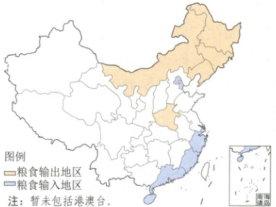 [四川资阳 2023 高二月考] 从“南粮北调”到“北粮南运”,中国农业历经千年形成的粮食产销格局在最近的 40 年被彻底改变了。下图为中国粮食产销格局示意图。读图,回答下面小题。