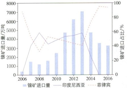 镍矿是战略性资源。目前我国镍矿资源占全球总量3%左右,但消费量居全球第一。印度尼西亚低品位红土镍矿储量丰富,易开采,难冶炼。2006年后中国企业在印度尼西亚投资采矿。2014年印度尼西亚政府颁布禁止镍矿出口政策后,中国企业利用其全球领先的低品位红土镍矿规模化冶炼技术,开始在该国建设镍冶炼厂,产品大部分销往中国。下图为2006—2016年中国镍矿进口量及从印度尼西亚、菲律宾镍矿进口占中国镍矿进口总量之比变化图。