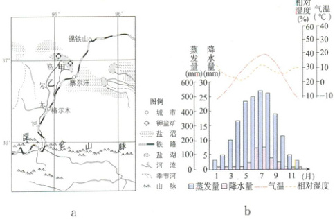 材料二 图a为察尔汗及周边地区略图,图b为察尔汗多年月平均气象要素图。