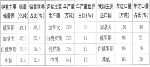 【解析】本题考查矿产资源与国家安全。根据材料信息可知,我国钾盐的储量较少,只占世界总储量的2.5%;我国从国外进口的钾盐量与我国钾盐年产量差距不大,自给率相对较低;国外钾盐资源的分布和生产相对集中,不利于我国钾盐供应的安全;我国进口钾盐的进口国相对单一,容易受国际局势的冲击;我国钾盐供应对国外依存度较高,受国际关系等影响较大,难以保障我国钾盐供应的安全等。