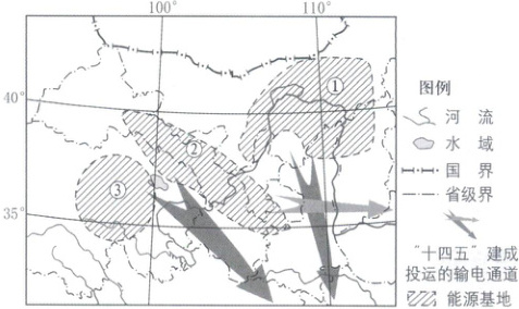 (1)本题考查我国能源分布。水能资源多分布于地势落差大且河流水量大的地区,③基地位于我国地势第一级阶梯内部(落差不大),黄河源区,水量小,水能资源少,A、C错误;火电不是清洁能源,B错误;图中三大基地位于我国青藏高原地区和西北干旱半干旱地区,降水少,晴天多,风力大,风能和太阳能资源都较丰富,D正确。