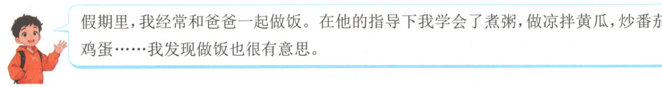 假期里,我经常和爸爸一起做饭。在他的指导下我学会了煮粥,做凉拌黄瓜,炒番茄鸡蛋……我发现做饭也很有意思。