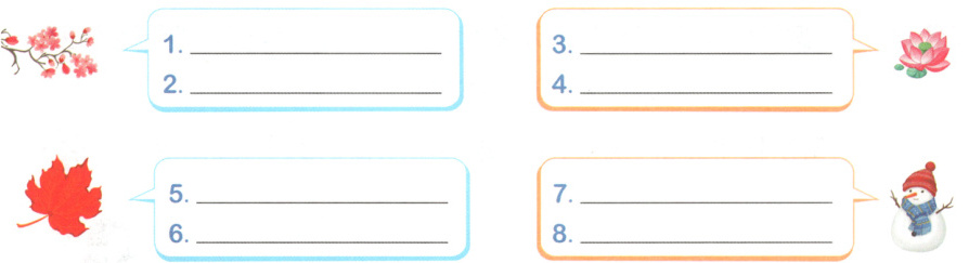 [体验四季] 四、请你回忆心中的四季,先分别用两个词语形容一下四季,再选择一个季节,用上相应的词语,写几句话。