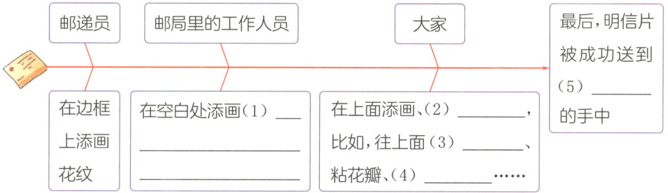明信片在寄往青蛙家的路上,经过了很多人的手。大家看了之后,都十分感动,于是也在上面添画、装饰,比如,往上面扎丝带、粘花瓣、洒香水……明信片变得越来越漂亮。