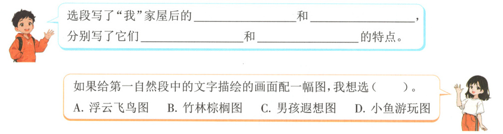 二、1.两丛竹子 一株棕榈 长得快 高大挺拔 B 解析:整段文字主要描绘的对象是竹林和棕榈,“竹林棕榈图”最能体现该段内容。 2.A 解析:“雨后春笋”是指春天下雨后竹笋长得很多很快,比喻新事物大量出现。 3.轻柔 示例:你好呀,快快和我一起成长吧! 4.示例:美丽的湖泊 大自然的宁静 浩瀚的森林 大自然的博大