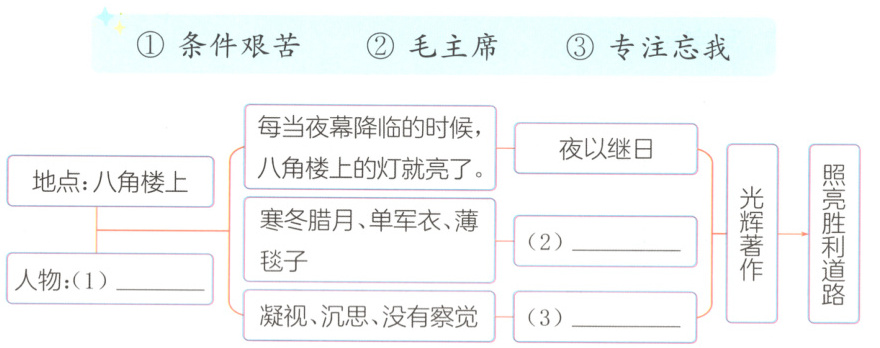 3. ③ 解析:从“清油灯”可知毛主席夜晚还在工作;“写下了许多光辉著作”“照亮了中国革命胜利的道路”表明毛主席的写作不仅是个人辛劳,更是对中国革命的理论指导,引领了中国革命前进的方向。